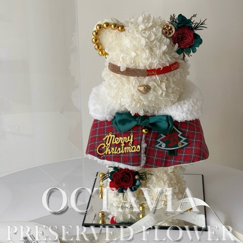 A款是紅色格仔披風的聖誕暴力熊,是以永生繡球花製作而成,非常精緻有格調