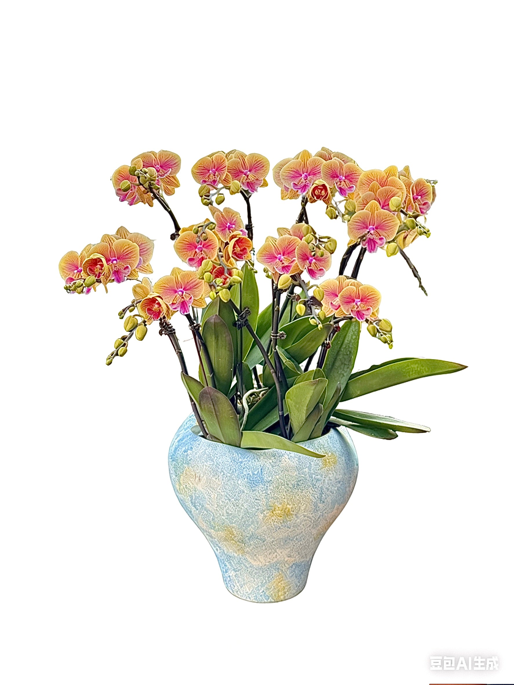這款賀年蘭花禮品精選自台灣頂級品種「悅橙」。此品種花色明亮且富層次感,黃色與蜜桃橙紅色的漸變花瓣,色澤飽滿、溫暖奪目。其色彩宛如初升旭日或金黃果實,寓意事業蒸蒸日上、前程錦繡。暖色調的色澤不僅為家居增添溫馨朝氣,更象徵著新的一年充滿活力與無限商機